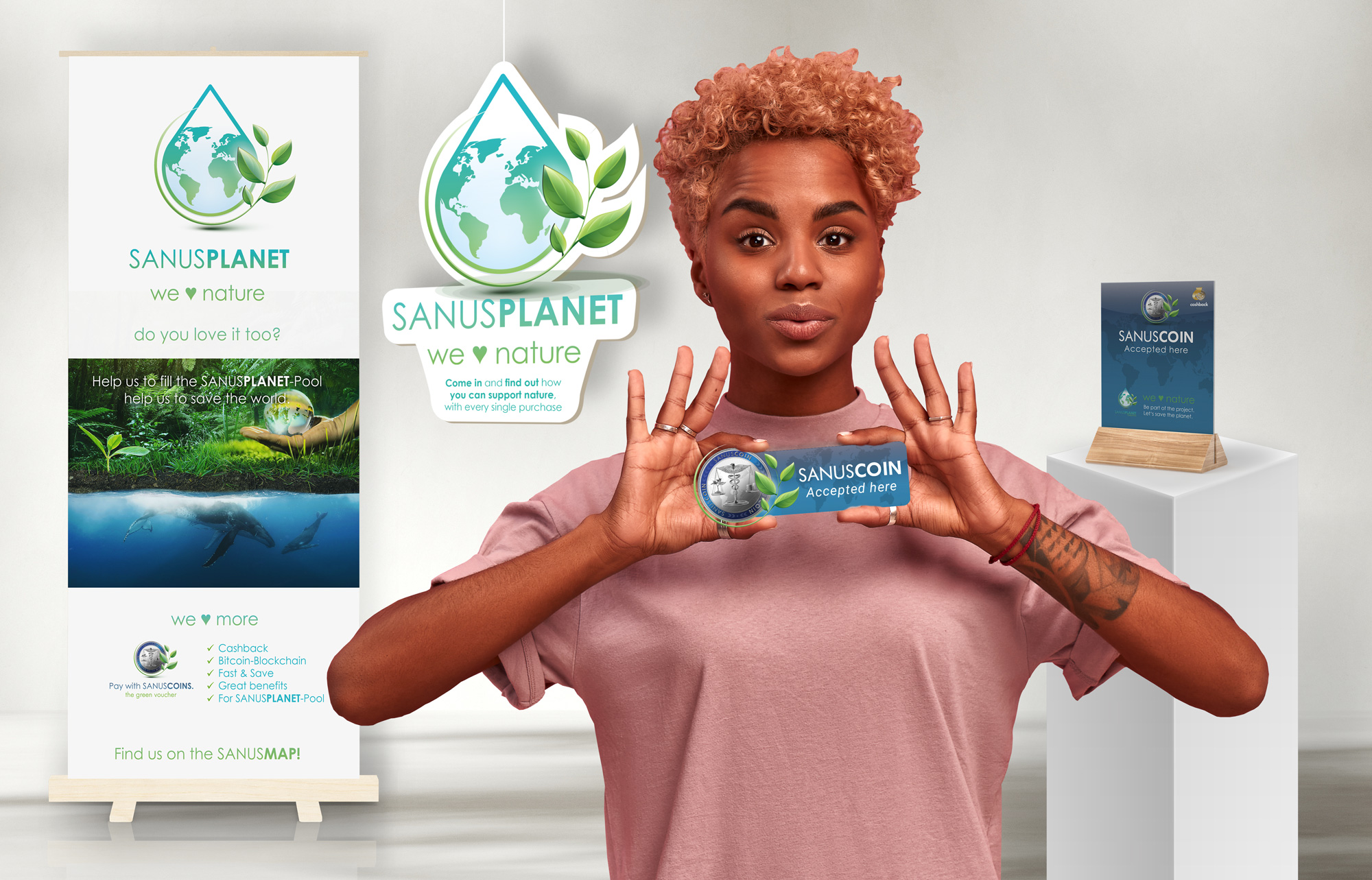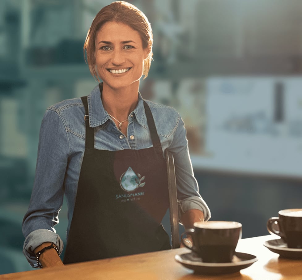 Falls du lokal für dein grünes Engagement und die kostenlose Zahlungsart SANUSPAY werben möchtest, kannst du weitere Merchandise-Artikel dazu bestellen. Wähle zwischen einen SANUSPLANET- und einen „Pay with SANUSCOIN“-Aufkleber für dein Schaufenster, einen SANUSPAY-Tischaufsteller sowie einen großen Stehbanner mit Werbung für die Initiative SANUSPLANET und die Zahlungsart SANUSPAY.